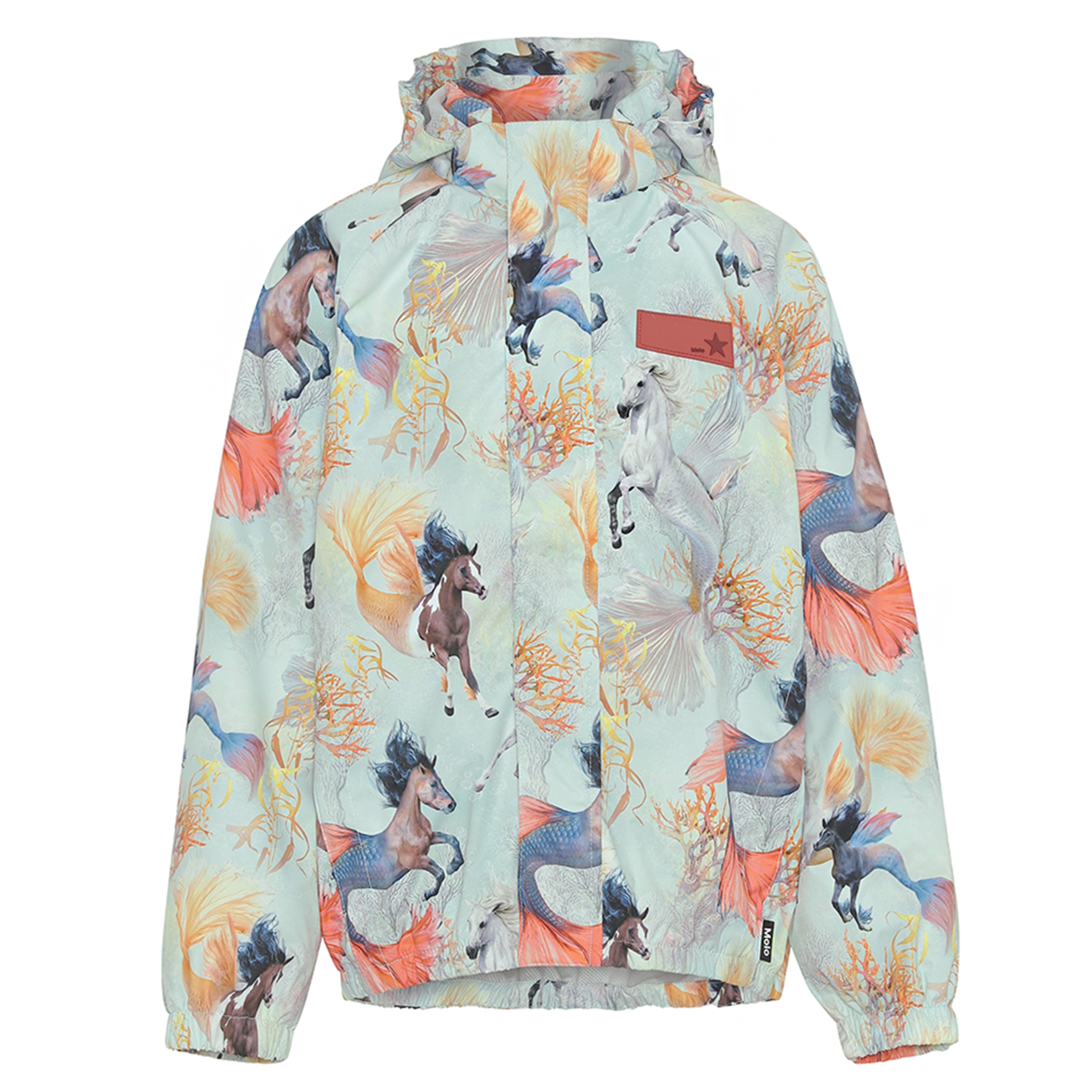 Waiton ist eine leichte und funktionelle Regenjacke in Hellblau mit einem Aufdruck von Seepferdchen. Waiton hat einen abgedeckten Reißverschluss, der vor Wind und Regen schützt, verschweißte Nähte, abnehmbare Kapuze und zwei Fronttaschen. Die Jacke hat Molos legendären Sternreflektor auf der Rückseite, der zusätzliche Sichtbarkeit im Dunkeln bietet. Dieses Produkt hat eine wasserabweisende PFC-freie Imprägnierung (enthält zB kein PFOS, PFOA und dergleichen). Wassersäulendruck: 5.000 mm. Atmungsaktivität: 5.000 g / m2 / 24h.