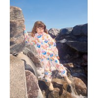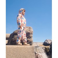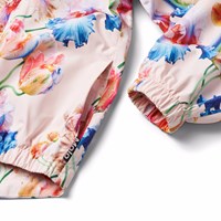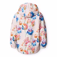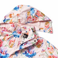Pinkfarbene wind- und wasserdichte Regenjacke aus recyceltem Polyester mit abnehmbarer Kapuze und einem Allover-Print von künstlerischen Blumen. Die Jacke hat eine normale Passform, Seitentaschen, elastische Bündchen und Saum, wasserdichte Nähte und einen Reißverschluss mit Kinnschutz und Sturmlasche, um das Wetter draußen zu halten.