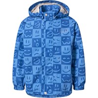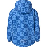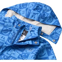Wind- und wasserdichter Regenmantel aus recyceltem Polyester. Der Mantel ist in Blautönen mit einem karierten Druck verschiedener Emojis. Er hat eine abnehmbare Kapuze, einen verdeckten Reißverschluss mit Kinnschutz, verdeckte Seitentaschen, elastische Bündchen und einen elastischen Saum.