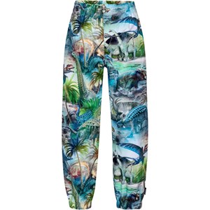 Regenhose mit Allover-Print aus verschiedenen Dinosauriern in Blau- und Grüntönen. Die Hose besteht aus einem leichten und atmungsaktiven Material, das auch bei hoher Aktivität verhindert, dass sich Kondenswasser und Feuchtigkeit an der Innenseite ansammelt. Die Regenhose hat einen verstellbaren Gummizug an der Taille und an der Beinöffnung. An einem Hosenbein befindet sich ein großer sternförmiger Reflektor für zusätzliche Sichtbarkeit im Straßenverkehr. Alle Nähte sind versiegelt, um das Eindringen von Wasser zu verhindern. Wassersäulendruck: 5.000 mm. Atmungsaktivität: 5.000 g/m²/24h.