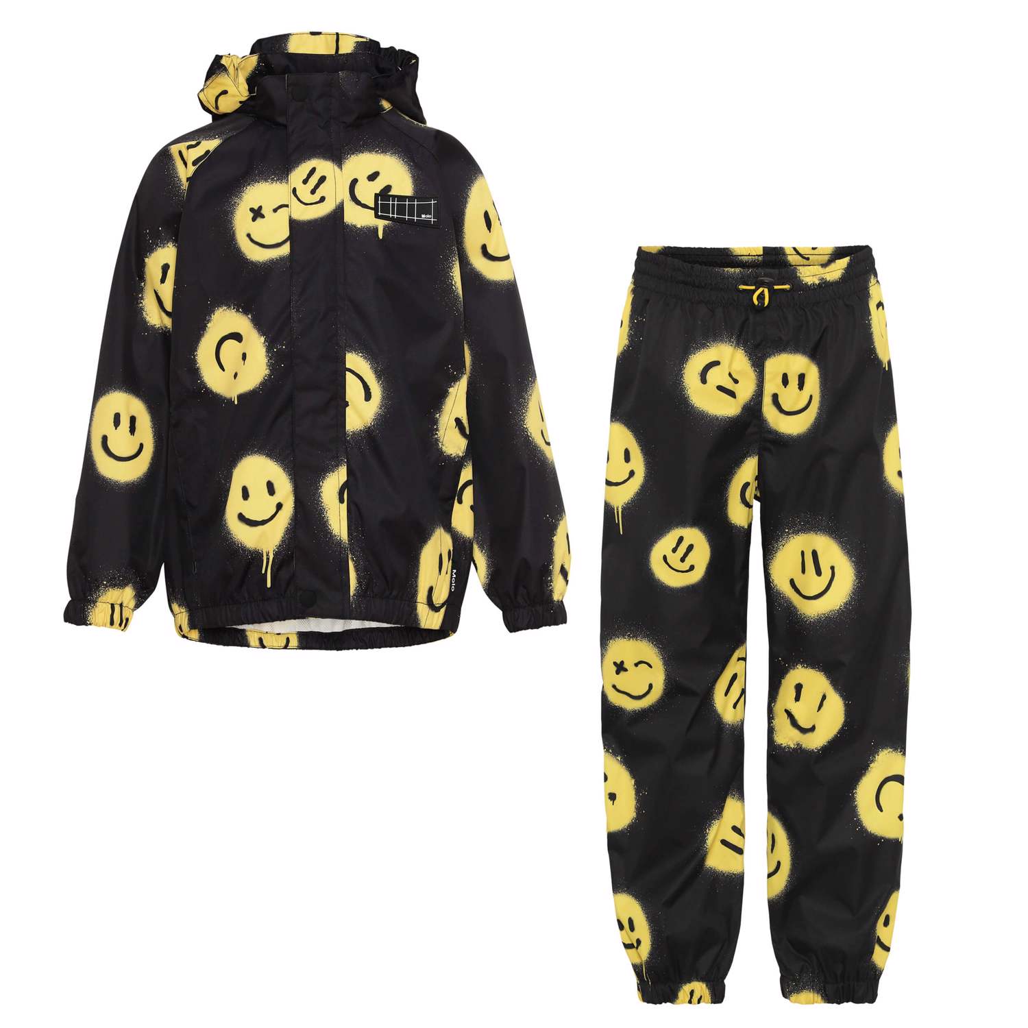 Whalley ist ein leichtes und funktionelles Regenset in Schwarz mit Smiley-Print. Die Regenjacke hat einen abgedeckten Reißverschluss, der vor Wind und Regen schützt, getapte Nähte, eine abnehmbare Kapuze und zwei Fronttaschen. Die Regenhose hat verschweißte Nähte, Gummizüge im Beinabschluss und in der Taille, die verstellbar sind. Sowohl die Regenjacke als auch die Hose haben auf der Rückseite den bekannten reflektierenden Stern von Molo. Ein großer Vorteil dieser Regenbekleidung ist auch, dass sie atmungsaktiv ist, sodass eine hohe Aktivität nicht zu einer feuchten Innenseite führt. Das Regenset hat eine wasserabweisende PFC-freie Imprägnierung (zB enthält kein PFOS, PFOA und dergleichen). Wassersäulendruck: 5.000 mm. Atmungsaktivität: 5.000 g / m2 / 24.