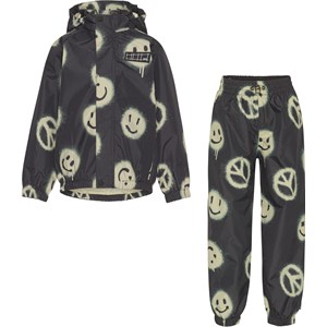 Whalley ist ein leichtes und funktionelles Regenset in Schwarz mit gelben Smileys. Die Regenjacke hat einen verdeckten Reißverschluss, der vor Wind und Regen schützt, getapte Nähte, eine abnehmbare Kapuze und zwei Fronttaschen. Die Regenhose hat getapte Nähte, Gummizug in der Beinöffnung und in der Taille, die angepasst werden kann. Sowohl die Regenjacke als auch die Hose haben den bekannten reflektierenden Stern von Molo auf der Rückseite. Ein großer Vorteil dieses Regenbekleidungsprodukts ist auch, dass es atmungsaktiv ist, sodass bei hoher Aktivität keine Feuchtigkeit im Inneren entsteht. Das Regenset hat eine wasserabweisende PFC-freie Imprägnierung (z. B. ohne PFOS, PFOA und dergleichen). Wassersäulendruck: 5.000 mm. Atmungsaktivität: 5.000 g/m2/24.