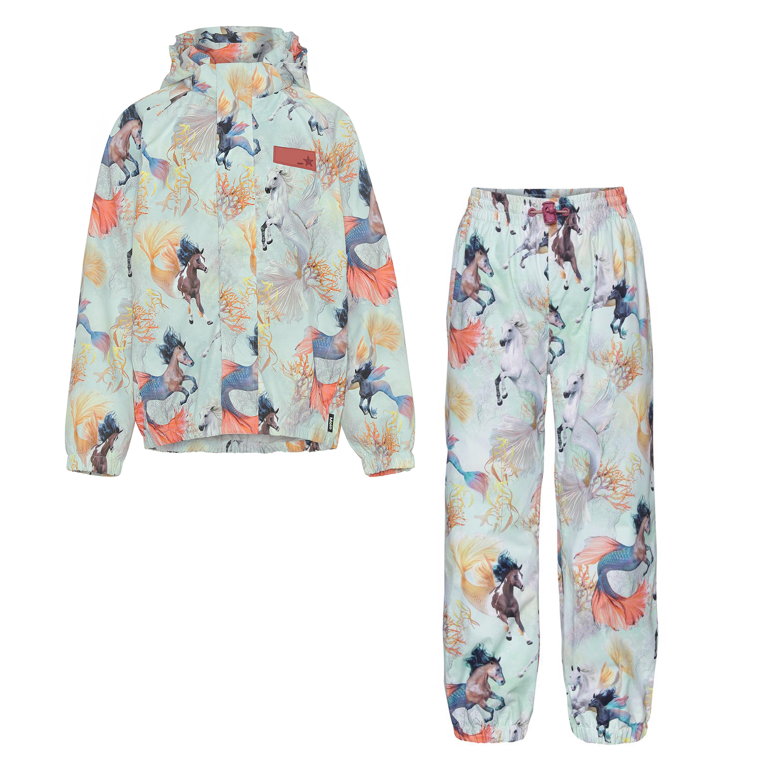 Whalley ist eine leichte und funktionelle Regen-Set in Hellblau mit Aufdruck von Seepferdchen. Die Regenjacke hat einen Reißverschluss, der vor Wind und Regen schützt, verschweißte Nähte, eine abnehmbare Kapuze und zwei Fronttaschen. Die Regenhose hat eine elastische Taille und Beinende. Sowohl die Regenjacke als auch die Hose haben Molos bekannten reflektierenden Stern auf der Rückseite. Das Regen-Set hat eine wasserabweisende PFC-freie Imprägnierung (enthält zB kein PFOS, PFOA und dergleichen). Wassersäulendruck: 5.000 mm. Atmungsaktivität: 5.000 g / m2 / 24h
