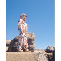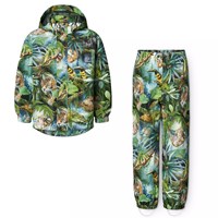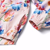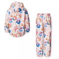 Pinkfarbenes wind- und wasserdichtes Regenset aus recyceltem Polyester mit einem Allover-Print von künstlerischen Tulpen. Die Jacke hat eine normale Passform, eine abnehmbare Kapuze, Seitentaschen, elastische Bündchen und Saum. Die Hose hat eine normale Passform, einen verstellbaren elastischen Bund, abnehmbare und verstellbare Gummibänder mit Molos-Logo und einen Reflektor am Hosenbeinende. Das gesamte Set hat wasserdichte Nähte, um das Wetter und den Wind draußen zu halten.