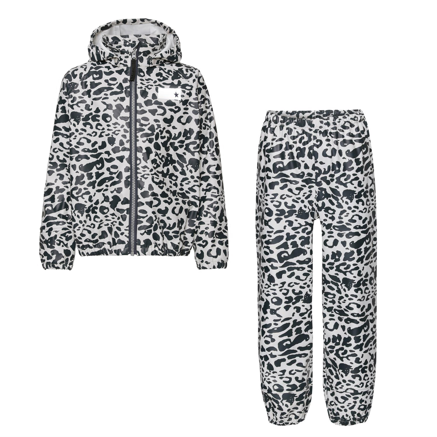 Zet ist eine Regen-Set mit blauem und weißem Leopardenmuster. Die Regenjacke hat eine abnehmbare Kapuze und einen Reißverschluss vorne. Die Regenhose hat eine elastische Taille und Beinende. Sowohl die Regenjacke als auch die Hose haben Molos bekannten reflektierenden Stern auf der Rückseite. Dieses Produkt hat eine wasserabweisende PFC-freie Imprägnierung (enthält zB kein PFOS, PFOA und dergleichen). Wassersäulendruck: 8.000 mm. Atmungsaktivität: 8.000 g / m2 / 24h. Dieses Molo-Produkt wird teilweise recycelt, da es zu 50% aus recycelbarem Polyester besteht. Der recycelbare Polyester ist aus gebrauchten Plastikflaschen und anderen Restmüll hergestellt. Die Herstellung von recyceltem Polyester erfordert weitaus weniger Ressourcen und stößt weniger CO2 aus, weshalb Molos Regen-Set die nachhaltige Wahl ist.