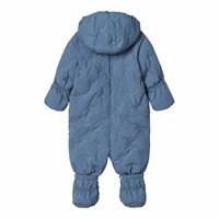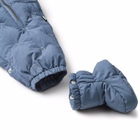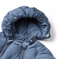 Wasserabweisender blauer Babyanzug mit kleinen gestickten lächelnden Gesichtern aus recyceltem Nylon. Der Anzug eignet sich für Spaziergänge im Kinderwagen an kalten Tagen und ist mit zwei Reißverschlüssen an der Vorderseite ausgestattet, die das An- und Ausziehen erleichtern, einer abnehmbaren Kapuze und kleinen abnehmbaren Füßen, die mit Knöpfen leicht ein- und ausgeklickt werden können. Der Anzug hat ein Futter aus Fleece, elastische Bündchen und Beinöffnungen, die an Handschuhen, Socken und Stiefeln festhalten, während sie vor Wind und Wetter schützen. Darüber hinaus hat der Anzug eine Füllung aus recyceltem Polyester, die für gleichmäßige Weichheit und optimale Wärmedämmung sorgt, und die wasserabweisende Oberfläche ist frei von PFOS und PFOA.