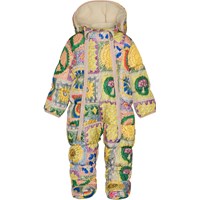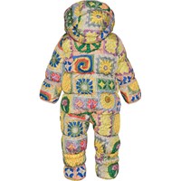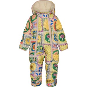 Warmer und weicher Baby-Schneeanzug oder Kinderwagenanzug mit einem farbenfrohen Aufdruck von Molos eigenen Häkelmaschen, die Regenbogen, fröhliche Gesichter, Pilze, Sonnenblumen und Peace-Zeichen enthalten. Der Schneeanzug ist Teil von Molos 'Everyday Exploration', die Oberbekleidung für viele Abenteuer des Alltags ist und gleichzeitig mit tollen Details oder Farben auffällt. Natürlich wird auch der Anzug aus verantwortungsvollen und recycelten Materialien hergestellt und erfüllt damit die hohen Ansprüche von Molo an Oberbekleidung.