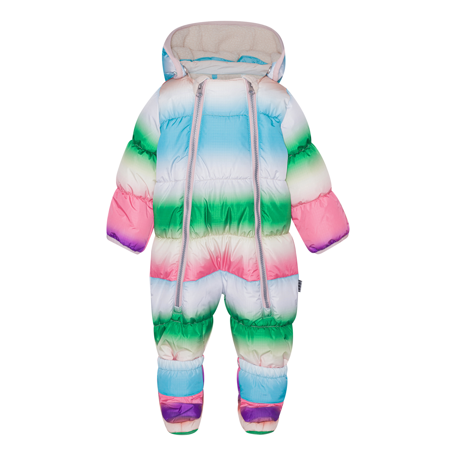 Warmer und weicher Baby-Schneeanzug oder Kinderwagenanzug mit pastellfarbenem Regenbogendruck. Der Schneeanzug ist Teil von Molos ‚Everyday Exploration‘, die Oberbekleidung für viele Abenteuer des Alltags ist und gleichzeitig mit tollen Details oder Farben auffällt. Natürlich wird auch der Anzug aus verantwortungsvollen und recycelten Materialien hergestellt und erfüllt damit die hohen Ansprüche von Molo an Oberbekleidung.