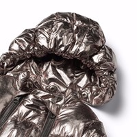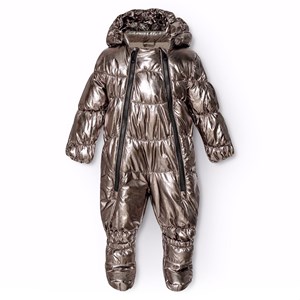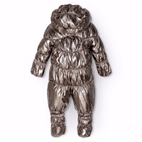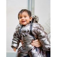 Stylischer silberner Babyschneeanzug, perfekt für kühle Spaziergänge im Kinderwagen. Der Anzug hat zwei Reißverschlüsse vorne, was das An- und Ausziehen erleichtert. Er hat auch eine abnehmbare Kapuze und kleine abnehmbare Füße, die leicht an- und abgeknöpft werden können. Der Anzug ist mit Fleece gefüttert und hat elastische Bündchen und Beinöffnungen, um Handschuhe, Socken und Stiefel an Ort und Stelle zu halten und vor den Elementen zu schützen.