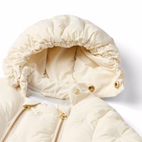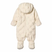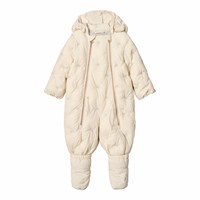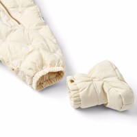 Wasserabweisender cremefarbener Babyanzug mit kleinen gestickten lächelnden Gesichtern aus recyceltem Nylon. Der Anzug eignet sich für Spaziergänge im Kinderwagen an kalten Tagen und ist mit zwei Reißverschlüssen an der Vorderseite ausgestattet, die das An- und Ausziehen erleichtern, einer abnehmbaren Kapuze und kleinen abnehmbaren Füßen, die mit Knöpfen leicht an- und abgeklickt werden können. Der Anzug hat ein Futter aus Fleece, elastische Ärmel- und Beinöffnungen, die an Handschuhen, Socken und Stiefeln festhalten und vor Wind und Wetter schützen. Darüber hinaus hat der Anzug eine Füllung aus recyceltem Polyester, die für gleichmäßige Weichheit und optimale Wärmeisolierung sorgt, und die wasserabweisende Oberfläche ist frei von PFOS und PFOA.