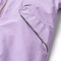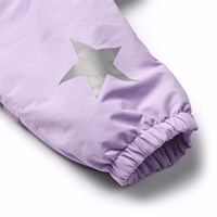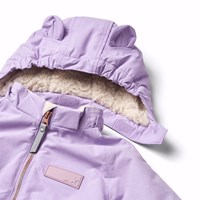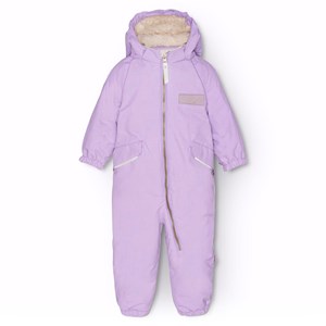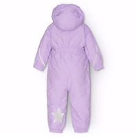 Lila warmer Schneeanzug für Babys und Kleinkinder aus recyceltem Polyester. Der Schneeanzug hat eine abnehmbare gefütterte Kapuze und einen extra langen und wasserdichten Reißverschluss auf der Vorderseite, um Schnee, Wind und Wasser draußen zu halten und das Anziehen zu erleichtern. Der Schneeanzug hat elastische Bündchen an Taille, Ärmeln und Beinen, um Schnee, Regen und Wind draußen zu halten und um Handschuhe und Stiefel zu halten. Der Schneeanzug hat Reflektoren an den Taschen und Ärmeln sowie einen großen sternförmigen Reflektor am Bein, um die Sichtbarkeit im Verkehr zu erhöhen. Der Schneeanzug hat gefütterte Vordertaschen und einen verstellbaren internen Gummizug an der Taille für Form und Passgenauigkeit um den Körper.