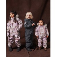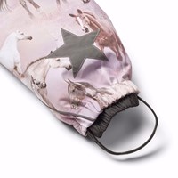 Schneeanzug aus recyceltem Polyester für einen kalten Winter mit einem schönen Pferdedruck in Rosa- und Lilatönen auf einem traumhaften Hintergrund. Der Schneeanzug hat eine abnehmbare gefütterte Kapuze und einen Reißverschluss mit Klappe, um Wind und Wasser abzuhalten. Es gibt elastische Bündchen an der Taille, den Ärmeln und den Beinöffnungen, um Schnee, Regen und Wind draußen zu halten. Der Schneeanzug hat reflektierendes Band entlang der Seitennähte, um die Kapuze herum und große sternförmige Reflektoren an den Ärmeln und Beinen, um die Sichtbarkeit im Verkehr zu erhöhen. Der Anzug ist mit 3M™ Thinsulate™ gefüttert, was dem Kind eine größere Bewegungsfreiheit bietet, und hat gefütterte Vordertaschen mit wasserdichten Reißverschlüssen.