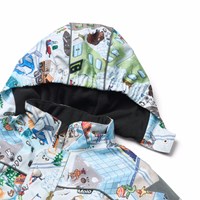 Wind- und wasserdichter Overall mit einem pixeligen Druck der realen Welt, lustigen Charakteren aus den Kollektionen von Molo aus recyceltem Polyester. Der Overall hat eine abnehmbare Kapuze mit Fleece, Vordertaschen mit Windschutzklappen, Frontreißverschlüsse mit Klappen und Kinnschutz, um ein Einklemmen der Haut zu verhindern. Der Overall verfügt über interne elastische Träger und Elastik an den Ärmel- und Beinöffnungen, um sicherzustellen, dass er richtig sitzt und effektiv Schnee, Regen und Wind draußen hält. Der Anzug ist mit reflektierendem Band und zwei großen Sternen an den Beinen für eine bessere Sichtbarkeit im Verkehr ausgestattet. Darüber hinaus ist die Jacke mit recyceltem Polyesterfleece, 3M™ Thinsulate™, gefüttert, das hilft, die Wärme zu speichern.