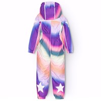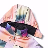 Schneeanzug aus recyceltem Polyester für einen kalten Winter mit einem mehrfarbigen überlaufenden Graffiti-Druck. Der Schneeanzug hat eine abnehmbare gefütterte Kapuze und Reißverschlüsse mit Klappen, um Wind und Wasser draußen zu halten. Er hat elastische Bündchen an der Taille, den Ärmeln und Beinen, um Schnee, Regen und Wind draußen zu halten. Der Schneeanzug ist mit Reflektoren entlang der Seitennähte, um die Kapuze und große sternförmige Reflektoren an den Ärmeln und Beinen ausgestattet, um die Sichtbarkeit im Verkehr zu erhöhen. Der Schneeanzug ist mit 3M™ Thinsulate™ gefüttert, was ihn leicht und für das Kind beweglicher macht. Außerdem gibt es gefütterte Vordertaschen mit wasserdichten Reißverschlüssen.