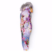 Schneeanzug aus recyceltem Polyester für einen kalten Winter mit einem Druck schöner Blumen in frischen Farben auf einem Hintergrund aus blauen und lila Tönen. Der Schneeanzug hat eine abnehmbare Kapuze mit Fleece, zwei Reißverschlüsse mit fleecegefüttertem Kinnschutz, um die Haut vor Einklemmen zu schützen. Der Schneeanzug hat eine innere Windschutzklappe und elastische Bündchen an Taille, Ärmeln und Beinöffnungen, um Schnee, Regen und Wind draußen zu halten. Der Anzug hat Reflektoren entlang der Seitennähte, um die Kapuze und große sternförmige Reflektoren an beiden Ärmeln und Beinen, um die Sichtbarkeit im Verkehr zu erhöhen. Der Anzug ist mit 3M™ Thinsulate™ gefüttert, das leicht ist und eine größere Bewegungsfreiheit für das Kind bietet.