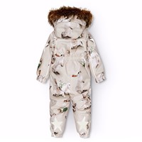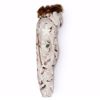 Schneeanzug aus recyceltem Polyester für einen kalten Winter mit niedlichem Hasenmuster zwischen Schneeglöckchen auf grauem Hintergrund. Der Schneeanzug hat eine abnehmbare Kapuze mit Fleece, zwei Reißverschlüsse mit fleecegefüttertem Kinnschutz, um die Haut vor Einklemmen zu schützen. Der Schneeanzug hat eine innere Windschutzklappe und elastische Bündchen an Taille, Ärmeln und Beinöffnungen, um Schnee, Regen und Wind abzuhalten. Der Anzug hat Reflektoren entlang der Seitennähte, um die Kapuze herum und große sternförmige Reflektoren an Ärmeln und Beinen, um die Sichtbarkeit im Verkehr zu erhöhen. Der Anzug ist mit 3M™ Thinsulate™ gefüttert, das leicht ist und eine größere Bewegungsfreiheit für das Kind bietet. Er hat auch Vordertaschen mit wasserdichten Reißverschlüssen.