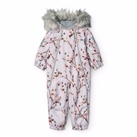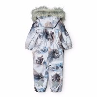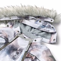 Wind- und wasserdichter Schneeanzug für einen kalten Winter mit einem Bison-Print in einer schneebedeckten Landschaft aus recyceltem Polyester. Der Schneeanzug hat eine abnehmbare gefütterte Kapuze mit abnehmbarem Kunstpelzbesatz, zwei Reißverschlüsse vorne und ein Rippen-Kinnband, um ein Einklemmen der Haut zu verhindern. Der Schneeanzug verfügt über eine innere Windschutzklappe und Elastik an Taille, Ärmel- und Beinabschlüssen, um Schnee, Regen und Wind draußen zu halten. Der Anzug ist mit reflektierendem Band entlang der Seitennähte, um die Kapuze und zwei großen Sternen an den Beinen für Sichtbarkeit im Verkehr ausgestattet. Darüber hinaus ist die Jacke mit recyceltem Polyesterfleece, 3M™ Thinsulate™, gefüttert, das hilft, die Wärme zu speichern.