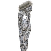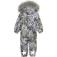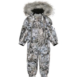 Pyxis ist ein funktionaler Schneeanzug für Babys und Kleinkinder in Grau mit Schneeleoparden-Prints. Der Schneeanzug hat eine abnehmbare Kapuze mit Kunstpelzkante, sowie zwei schräge Reißverschlüsse an der Vorderseite, die das An- und Ausziehen erleichtern, Schneefang in der Beinöffnung, Gummiriemen unter dem Fuß und Molo's gut bekannter Reflexstern an den Oberarmen und der Rückseite der Beine. Der Schneeanzug besteht aus einem winddichten, wasserdichten und atmungsaktiven Material, während Futter und Innenmaterial recycelt sind und aus wiederverwertbarem Polyester bestehen. Der Schneeanzug hat auch verklebte Nähte. Dieses Produkt hat eine wasserabweisende PFC-freie Imprägnierung (zB enthält kein PFOS, PFOA und dergleichen). Der Wassersäulendruck und die Atmungsaktivität wurden weiter verbessert und betragen jetzt bis zu 15.000 mm Wassersäulendruck und eine Atmungsaktivität von 15.000 g/m2/24h.