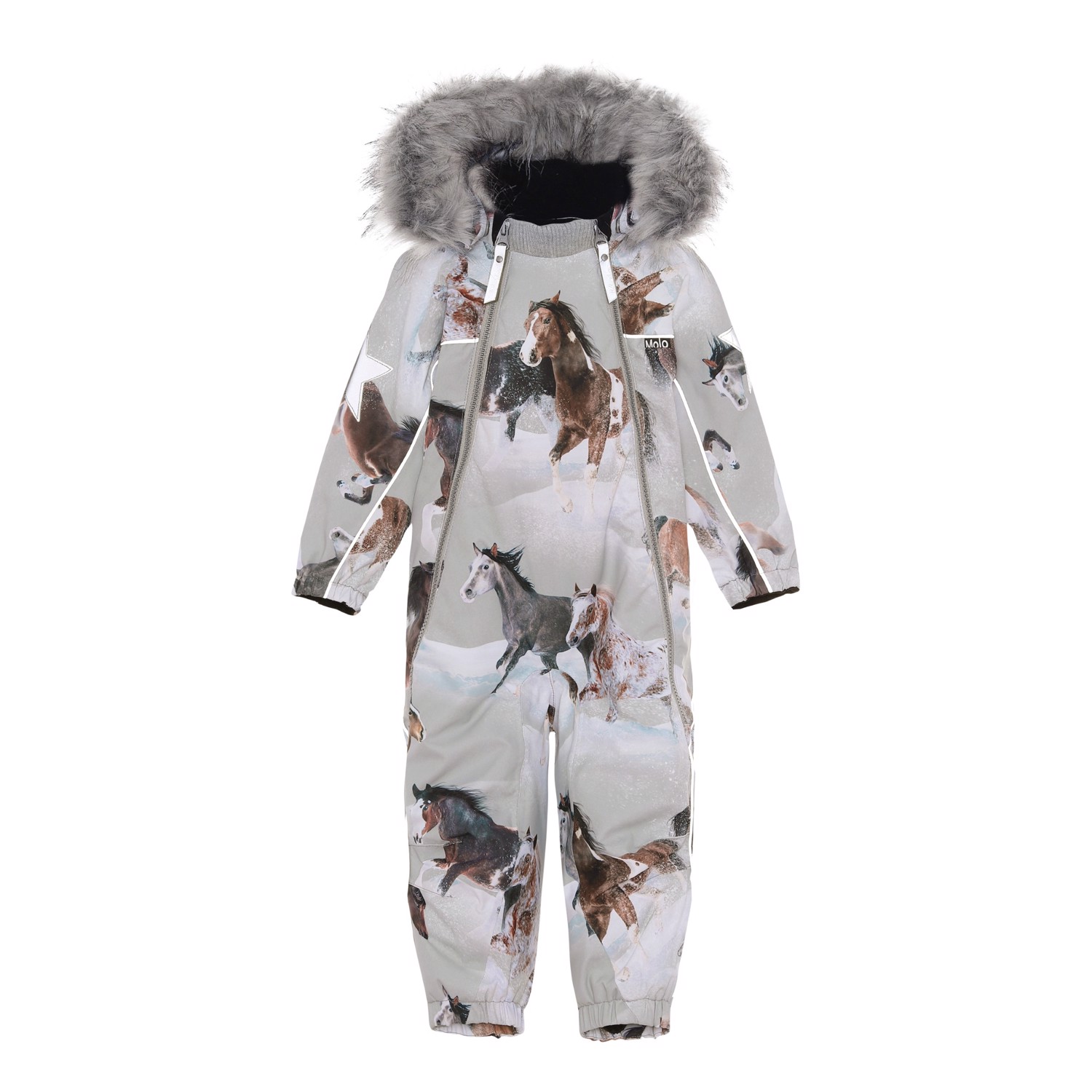 Pyxis ist ein funktioneller Fluganzug für Babys und Kleinkinder in Hellgrau mit Pferdeaufdruck. Pyxis ist aufgrund seiner unglaublich hohen Atmungsaktivität und Isolierung sowohl für die extrem kalten als auch für gewöhnliche Winter perfekt. Die hohe Atmungsaktivität hilft, die Körpertemperatur zu regulieren und sorgt dafür, dass Ihrem Kind nicht zu kalt oder zu heiß wird. An wärmeren Wintertagen kann das Kind daher mit dünnen Schichten darunter auskommen und an Tagen mit heftigen zweistelligen Minusgraden können Sie mit einer zusätzlichen Schicht darunter ergänzen. Wenn Sie ein stillsitzendes Kind haben, ist Pyxis auch eine offensichtliche Wahl.Der Fliegeranzug hat eine abnehmbare Kapuze mit schönem Kunstpelzkragen, sowie zwei schräge Reißverschlüsse auf der Vorderseite, die das An- und Ausziehen des Anzugs erleichtern, Schneefang in der Beinöffnung, Gummiband unter dem Fuß und Molo's Bekannter Reflexstern an Oberarmen und Beinrückseite. Der Fluganzug besteht aus einem winddichten, wasserdichten und atmungsaktiven Material. Das Außenmaterial besteht zu 45% aus recyceltem Polyester, das 3M™ Thinsulate™ Futter zu 83% aus recyceltem Polyester und die Innenseite zu 100% aus recyceltem Nylon. Dieses Produkt hat eine wasserabweisende PFC-freie Imprägnierung (zB enthält kein PFOS, PFOA und dergleichen). Der Wassersäulendruck und die Atmungsaktivität wurden weiter verbessert und liegen nun bei bis zu 15.000 mm Wassersäulendruck und einer Atmungsaktivität von 15.000 g/m2/24 Std.