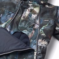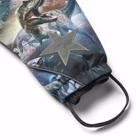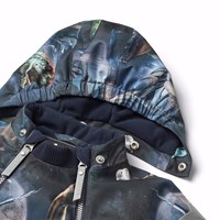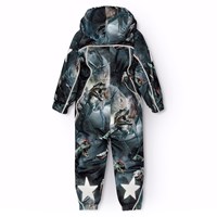 Blauer Schneeanzug aus recyceltem Polyester für einen kalten Winter mit einem Druck von Dinosauriern im Weltraum. Der Schneeanzug hat eine abnehmbare Kapuze mit Fleece, zwei Reißverschlüsse mit fleecegefütterten Kinnschützern, um ein Einklemmen der Haut zu verhindern. Er hat eine innere Windschutzklappe und elastische Bündchen an Taille, Ärmeln und Beinöffnungen, um Schnee, Regen und Wind abzuhalten. Der Anzug hat Reflektoren entlang der Seitennähte, um die Kapuze und große sternförmige Reflektoren an Ärmeln und Beinen, um die Sichtbarkeit im Verkehr zu erhöhen. Der Anzug ist mit 3M™ Thinsulate™ gefüttert, was eine größere Bewegungsfreiheit für das Kind ermöglicht.